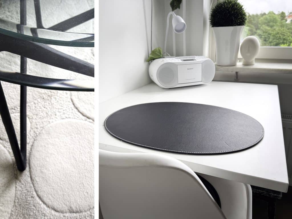 På en av Solveigs ljusa mattor står ett bord av glas som ger en luftig känsla. I köket finns en smart och yteffektiv matplats