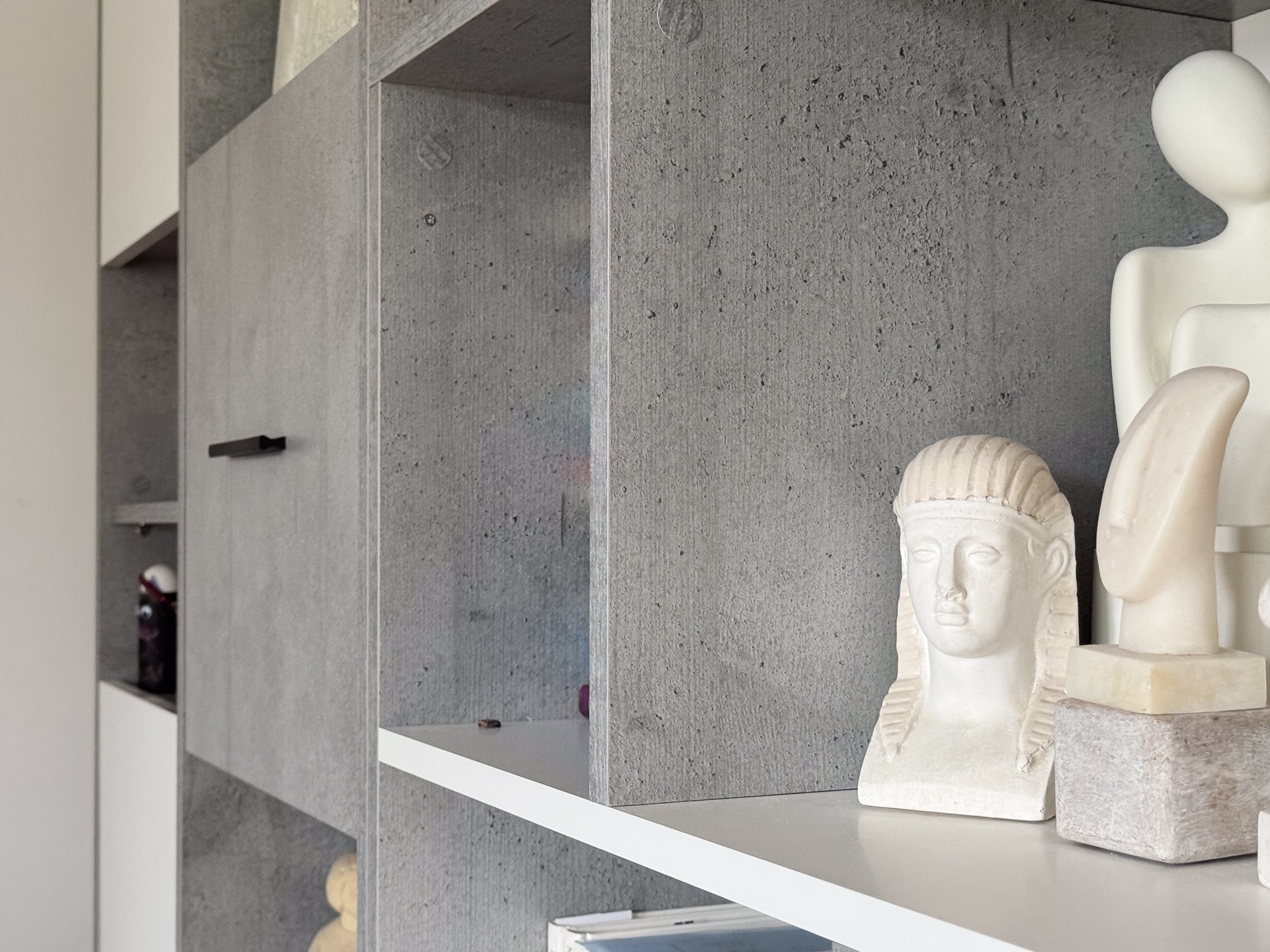 Solveig har både öppen och stängd förvaring som gör att hon både kan dölja och visa upp. Ett smart sätt är att samla föremål i gruppering, det ger ett renare intryck än att sprida ut dem. Och så blir det ett intressant blickfång.